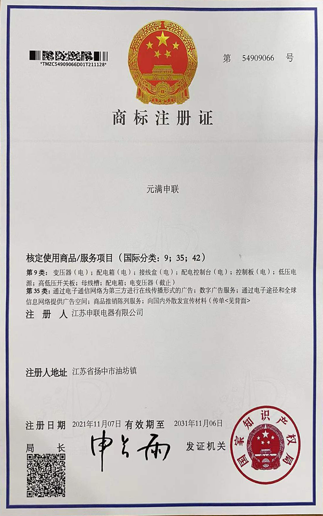 • 商標注冊證
